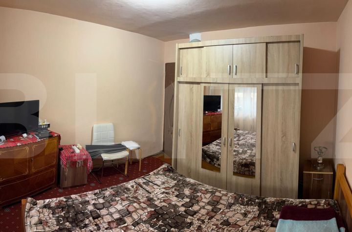 Dormitorul este aerisit și luminos, mobilat cu pat matrimonial și dulap încăpător.