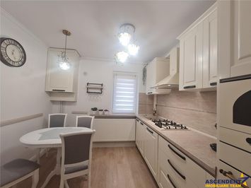 - hol la intrare, bucatarie inchisa, echipata complet cu plita si cuptor, masina de spalat vase, centrala termica proprie, living spatios cu canapea extensibila, hol mic intre camere cu un spatiu tip dressing unde sunt situate masina de spalat rufe si uscatorul de rufe, baie cu cabina de dus tip walk in si aerisire naturala, dormitor cu pat mare impozant si dulap tip dressing.