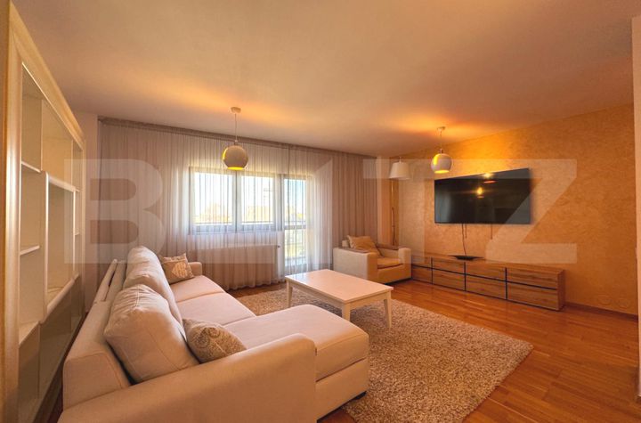 - Un living spațios, mobilat cu canapea confortabilă și TV, cu acces direct la balcon.