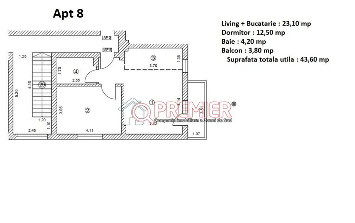 STU - SUPRAFAȚA TOTALĂ UTILĂ: 43.6 mp,SUPRAFAȚĂ TERASE/BALCOANE: 3.8 mp