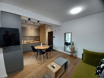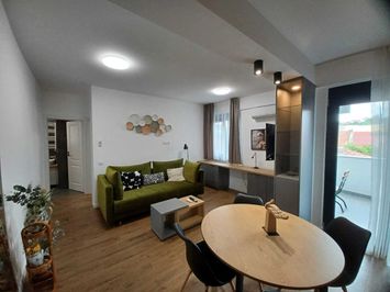 Apartamentul este compus din living (canapea extensibila) si bucatarie cu loc de luat masa (complet utilata si mobilata), dormitor (pat matrimonial), baie si balcon (11 mp). Mobilierul si electrocasnicele sunt noi. Incalzire in pardoseala, sistem centralizat, apa termala. Apartamentul este dotat cu aer conditionat si jaluzele electrice, cu actionare prin telecomanda. Optional este disponibil un loc de parcare in curtea interioara, acoperit, 50 Euro + TVA/luna.