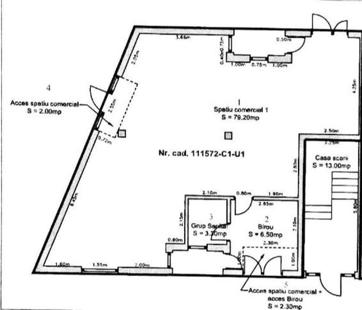 Compartimentare eficientă open space, birou și grup sanitar, 2 căi de acces - intrare principală și acces secundar pentru aprovizionare.