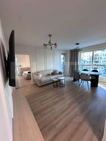 Mobilat și finisat în stil modern, apartamentul dispune de toate dotările necesare: combina frigorifică, cuptor electric, plită, hotă, mașină de spălat rufe și vase, aer condiționat. Siguranța este asigurată de ușa antiefracție, ferestrele cu tamplarie PVC și geamuri termopan, iar confortul termic vine de la centrala termică proprie, distribuită prin pardoseală și cu repartitoare în fiecare cameră.