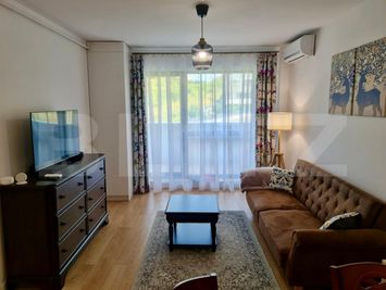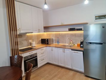 Apartamentul se vinde complet mobilat si utilat, fiind amenajat cu finisaje moderne si dotat cu sistem Smart Home, aer conditionat, incalzire in pardoseala si centrala termica in condensare. Bucataria este realizata la comanda si echipata cu electrocasnice moderne, iar baia dispune de dus walk-in cu sticla securizata.