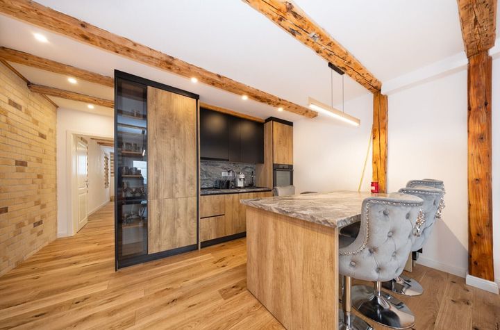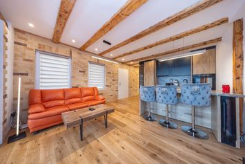 Accesul se face printr-o veranda inchisa, amenajata ca antecamera, care creeaza o tranzitie placuta catre zona principala a locuintei. Livingul open-space cu bucatarie, generos de aproximativ 40 mp, ce impresioneaza prin volum, lumina naturala si atmosfera calda data de barnele originale din lemn, atent reconditionate. Insula centrala si bucataria complet echipata transforma acest spatiu intr-un loc ideal pentru relaxare.