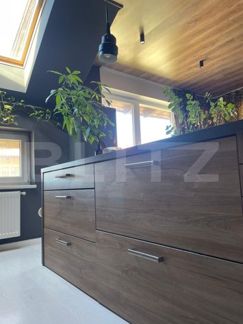 Spațiul deschis al bucătăriei și livingului impresionează prin designul sofisticat, unde tonurile calde ale lemnului se armonizează cu nuanțele mate de gri și accentele negre ale corpurilor de iluminat. Mobilierul minimalist și finisajele premium conferă un aer rafinat, iar lumina naturală care pătrunde prin ferestrele generoase creează o atmosferă primitoare. Bucătăria este complet utilată, ce devine centrul perfect pentru relaxare sau momente petrecute cu cei dragi. Detaliile atent alese, plantele naturale și textura plăcută a materialelor transformă acest spațiu într-un cămin cu adevărat special, locul ideal pentru cei care apreciază confortul, stilul și liniștea de acasă.