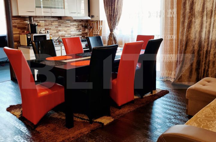 Acesta se afla situat la etajul 1 al unui bloc din caramida izolat termic la exterior, dispune de centrala termica proprie, tamplarie PVC cu geam termopan, aer conditionat si este compus din: living cu bucatarie open space, dormitor, baie si balcon. In pretul apartamentului este inclusa si o boxa situata la demisolul blocului. Pentru cei interesati exista posibilitatea inchirierii unui loc de parcare in imediada vecinatate a blocului, in parcarea amenajata de Primarie.