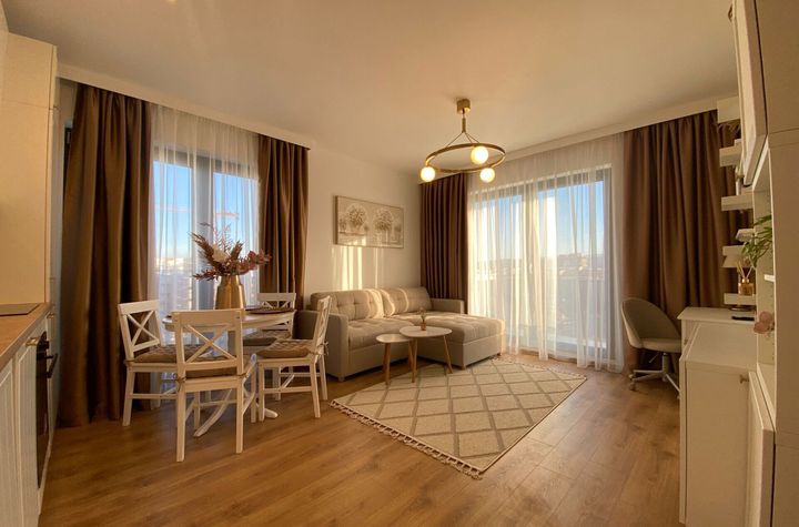 Mobilat: mobilat lux, Stare interior: ultrafinisat, Bucatarie: deschisa separata, Mobilata, Echipata, Frigider, Aragaz, Hota, Masina de spalat vase, Compartimentare: decomandat, Usi interior: mdf, Proprietarul plateste: cablu tv, Curte: comuna, Strazi limitrofe: asfaltate, Orientari: sud - est, Vedere: vedere spre oraș