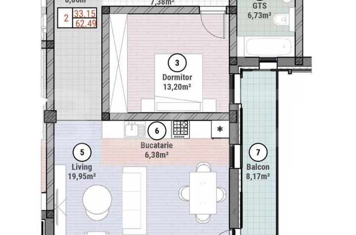 Proprietatea este compusă din : living+ bucătărie , dormitor , baie+ balcon de 8,17 mp. suprafată utilă 62,49 mp.