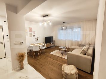 Apartamentul este amplasat la parterul unui bloc nou cochet cu doar 2 etaje si ofera un confort deosebit: living open space cu bucatarie complet utilata, dormitor spatios, 2 bai (una de serviciu si una dotata cu cabina de dus), finisaje moderne si mobilier nou.