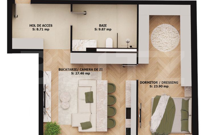 Dormitorul impresionează printr-un dressing generos tip walk-in, conceput asemenea unei galerii personale, unde funcționalitatea întâlnește estetica. Livingul primitor și bucătăria modernă completează un ambient coerent, perfect pentru un stil de viață contemporan, fără compromisuri.