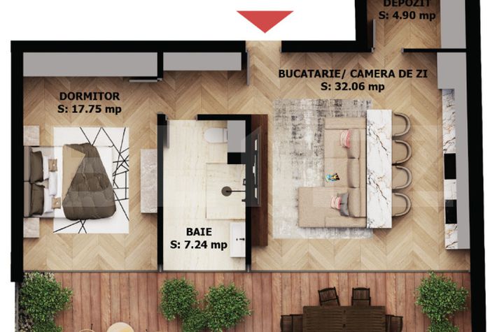 Dormitorul matrimonial se transformă într-o adevărată oază de liniște, completată de o baie generoasă și spațiu amplu pentru odihnă și intimitate. Terasa uriașă devine extensia naturală a locuinței – locul ideal pentru seri relaxante, priveliști urbane și un stil de viață modern.