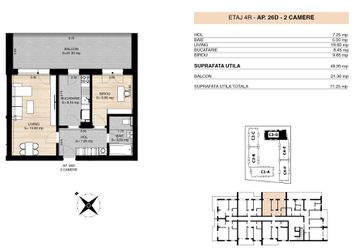 STU - SUPRAFAȚA TOTALĂ UTILĂ: 71.25 mp,SUPRAFAȚĂ TERASE/BALCOANE: 21.3 mp,Apartament 2 camere decomandat cu o suprafata totala utila de 71,25 mp . Compartimentare : - Hol : 7,25 mp - Baie : 5,00 mp - Living : 19,00 mp - Birou : 9,65 mp - Bucatarie : 8,45 mp - Balcon : 21,30 mp