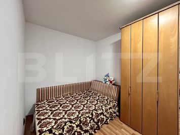 Dormitorul oferă un spațiu restrâns dar plăcut amenajat, cu un pat tip canapea extensibilă și un șifonier cu uși din lemn și oglinzi.