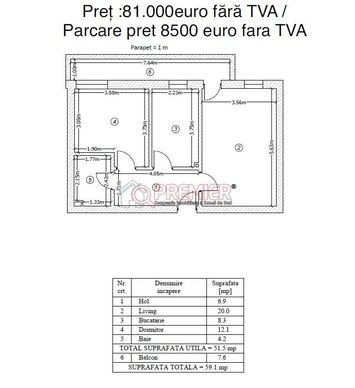 STU - SUPRAFAȚA TOTALĂ UTILĂ: 59.1 mp,SUPRAFAȚĂ TERASE/BALCOANE: 7.6 mp