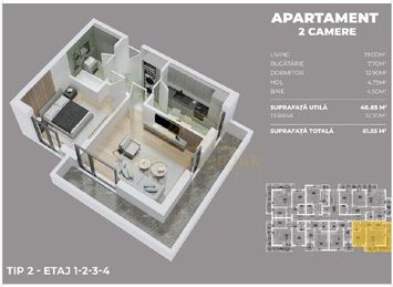 Apartament cu 2 camere,decomandat,suprafata utila 61.55 mp,1 balcon