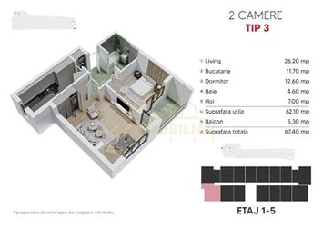 STU - SUPRAFAȚA TOTALĂ UTILĂ: 67.4 mp,SUPRAFAȚĂ TERASE/BALCOANE: 5.3 mp