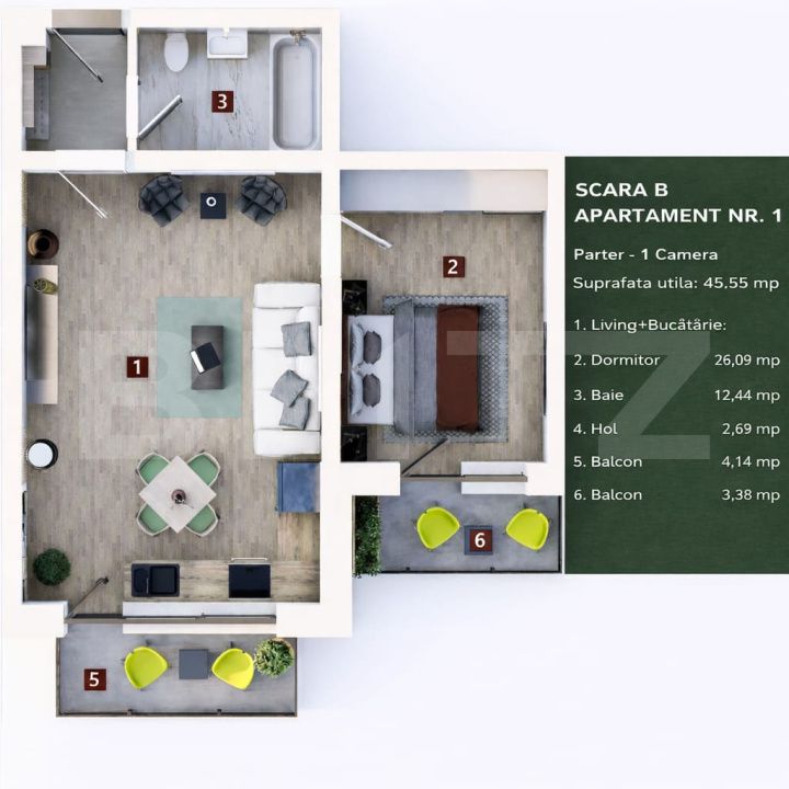 Blitz propune la vânzare apartament cu 2 camere, bucătărie open space cu living, situat la parterul unui imobil modern. Locuința are o suprafață utilă de 45,60 mp și este compartimentată eficient pentru a oferi confort și funcționalitate. Apartamentul este compus din living spațios cu bucătărie open space, dormitor luminos, baie și balcon de 4,14 mp. Compartimentarea este practică, iar suprafețele sunt bine optimizate pentru a crea un ambient aerisit și plăcut. Proprietatea este ideală atât pentru locuit, cât și pentru investiție, fiind potrivită pentru un cuplu sau pentru închiriere. Zona oferă acces facil către puncte de interes precum magazine, mijloace de transport, școli și alte facilități urbane. Pentru mai multe detalii sau pentru programarea unei vizionări, vă stăm la dispoziție.