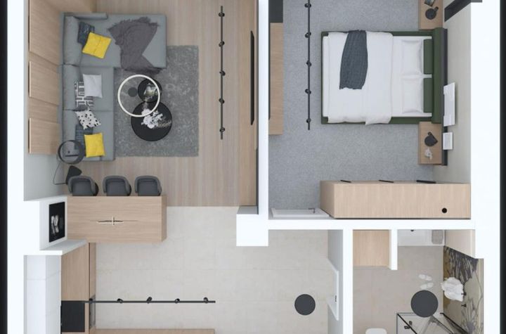 Zona de zi te întâmpină cu un living spațios cu bucătărie open-space (27,38 mp), gândit pentru momente de relaxare, socializare și lumină naturală din plin. Dormitorul generos (14,71 mp) devine refugiul tău de liniște, perfect pentru odihnă și intimitate.