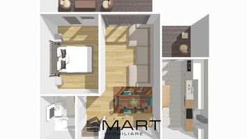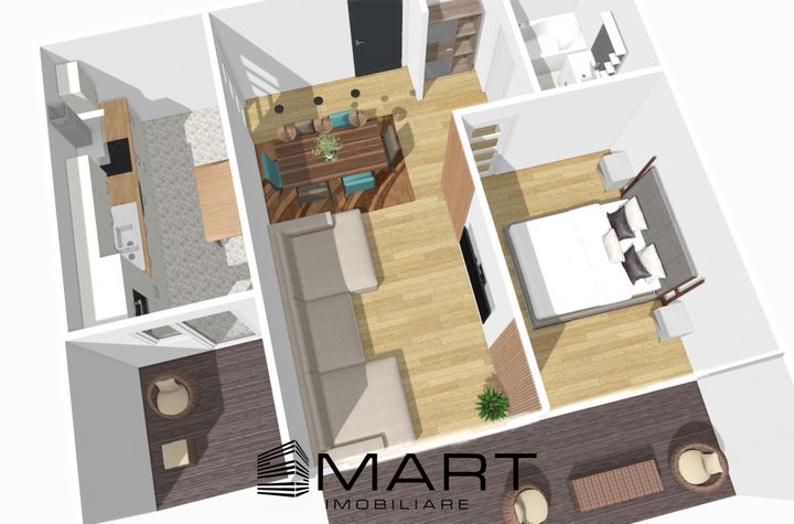 Compartimentarea este una practică, cu o delimitare clară între zona de zi și zona de noapte. Apartamentul cuprinde living, 1 dormitor, 1 bucătărie, 1 baie și hol de acces. Spațiile exterioare includ 2 balcoane cu o suprafață totală de aproximativ 12 mp oferind locuri suplimentare pentru relaxare sau depozitare.
