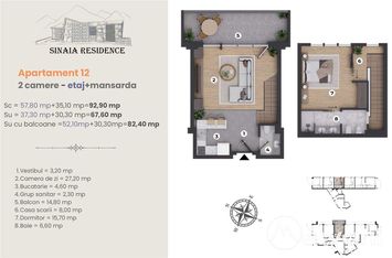 Apartament cu 2 camere cu finisaje de LUX in Sinaia la etaj + mansarda in imobil nou din zona Furnica. Apartament nr. 12