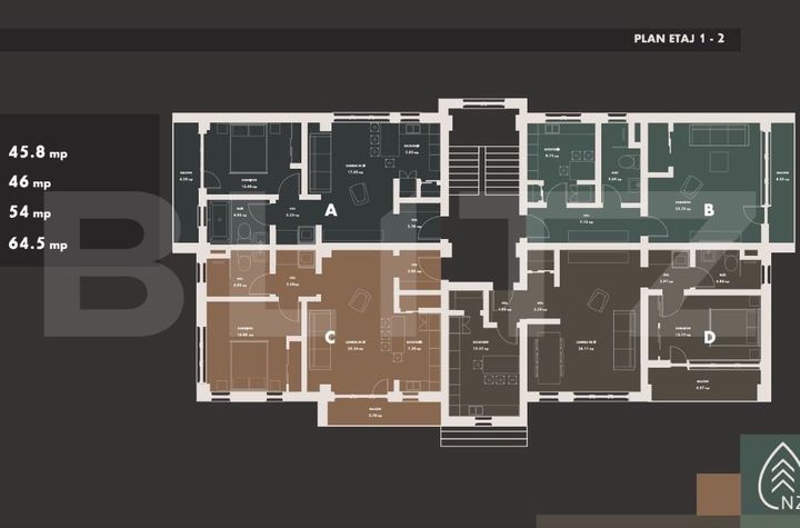 Apartamentul are 2 camere si o suprfata utila de 46,5 mp.