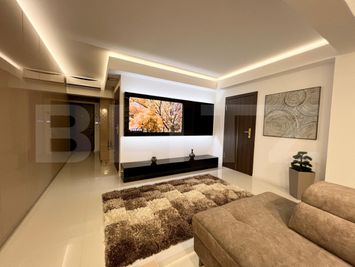 -Living luminos și aerisit, decorat cu un perete 3D spectaculos, colțar premium și iluminat ambiental care oferă o atmosferă relaxantă;