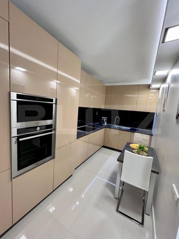 -Bucătărie modernă, complet mobilată și utilată, cu electrocasnice încorporate și finisaje lucioase în tonuri calde de bej și negru;