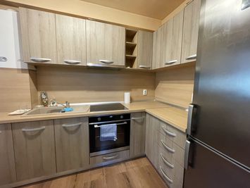 Bucataria este complet utilata cu plita, cuptor electric, hota si frigider.