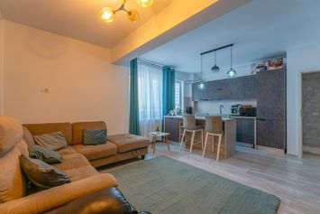 Locuinta este situata la etajul 3 din 5, intr-un imobil dotat cu lift, avand o suprafata utila de 46 mp. Compartimentarea este una practica, fiind formata din living si bucatarie integrate intr-un spatiu deschis, un dormitor separat, baie si un hol de acces.