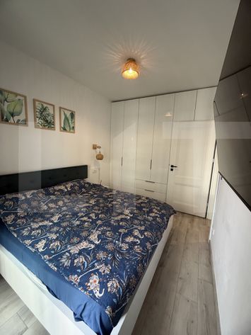 Dormitor: Intim și relaxant, dotat cu pat matrimonial, spații de depozitare integrate și iluminat ambiental.