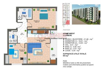 STU - SUPRAFAȚA TOTALĂ UTILĂ: 69 mp,SUPRAFAȚĂ TERASE/BALCOANE: 5 mp