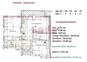 Apartamentul beneficiaza de o compartimentare eficienta, cu hol de 6,51 mp, living generos cu bucatarie de 28,39 mp, dormitoare de 16 si 12 mp, doua bai de 4,58 mp si 3,03 mp si un balcon de 5,37 mp. Suprafata utila a locuintei este de 70,54 mp, iar suprafata totala, inclusiv balconul, este de 75,91 mp.