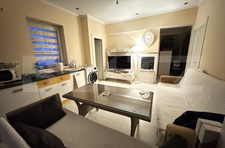 Locuința impresionează prin finisaje elegante și o atmosferă caldă, fiind amenajată cu atenție la detalii. Livingul open-space cu bucătărie oferă un spațiu optim de socializare, iar dormitoarele sunt luminoase și confortabile, cu mobilier stil clasic modern. Baia principală este spațioasă, cu cadă incorporată și finisaje de calitate, iar toaleta de serviciu oferă un plus important de funcționalitate. Apartamentul este însoțit de un loc de parcare.