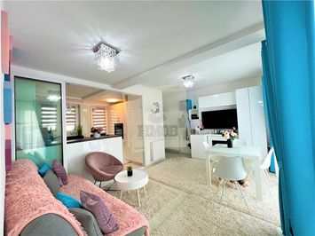 -living modern amenajat cu bucatarie complet mobilata si utilata cu electrocasnice (bucatarie este delimitata printr-un geam culisant din sticla)