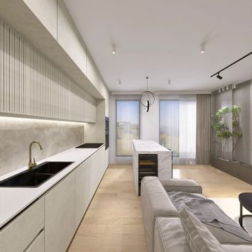 Compartimentarea este practică și luminoasă: living cu bucătărie deschisă și zonă de dining, hol, baie, două dormitoare, dintre care unul matrimonial cu baie proprie.