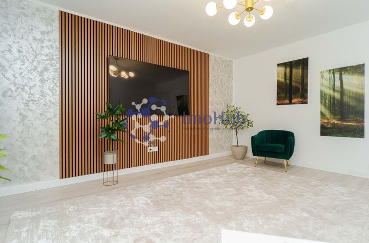 Mobilat: mobilat, Stil mobilier: modern, Stare mobilier: nou, Materiale mobilier: pal/pfl, Mdf, Stare interior: nou, Bucatarie: modern mobilata, Echipata, Complet echipata, Frigider, Cuptor microunde, Plita electrica, Cuptor electric, Inchisa, Compartimentare: decomandat, Usi interior: mdf, Vechime imobil: nou, Stadiu constructie: finalizat, Stare imobil: exceptionala, Structura: beton, Cadre, Pereti exteriori: bca, Pereti interiori: bca, Fatada: vopsea decorativa, Acoperis: beton - terasa circulabila, Izolatie exterioara: vata bazaltica, Plansee: beton armat, Confort: lux, Acces: acces stradal, Strazi limitrofe: amenajate, Asfaltate, Orientari: sud - est