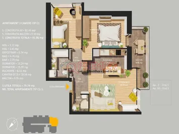 Este impartit astfel, 71 de metri patrati utili plus o terasa de 9 metri patrati. Fiind amplasat la etajul 1 apartamentul beneficieaza de liniste si intimitate.