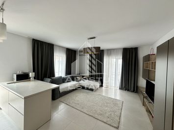 Living luminos, open-space, cu bucatarie complet mobilata si utilata, cu zona de dining si iesire pe terasa deschisa