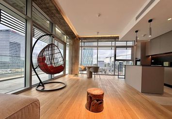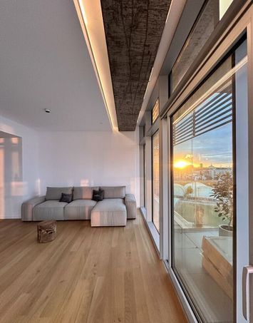 Apartamentul este amplasat la etajul 11, cu un view superb, finisajele interioare si mobilierul respecta cele mai inalte standarde de calitate, iar imbinarea culorilor si a texturilor ofera confort si intimitate.
