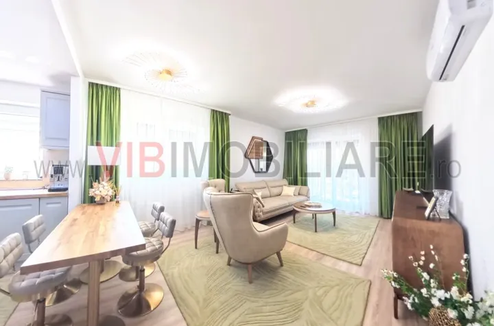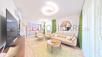 Apartamentul dat spre inchiriere, are o suprafata utila toatala cu inclusiv terasa de 93mp, este confort 1, semidecomandat , are zona de zi separata de zona de noapte, un dormitor matrimonial. Totul este finisat, mobilat, utilat cu finisaje, mobilier, electrocasnice din game premium, totul este nou, amenajat cu stilist, in culori deschise, compatibile. Este luminos , terasa poate fi reglabila, este finisata.