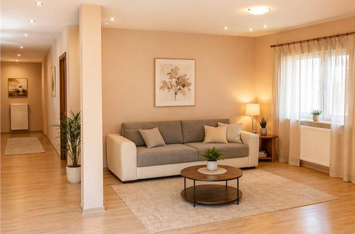 Locuința oferă un spațiu bine organizat, cu zone generoase și funcționale, potrivit atât pentru locuit permanent, cât și ca investiție.