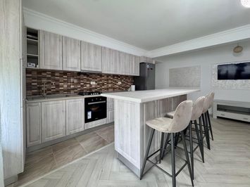 Dotari: spatii generoase de depozitare, masina de spalat vase, masina de spalat rufe, aer conditionat, plita si cuptor pe gaz, hota, frigider, televizor.