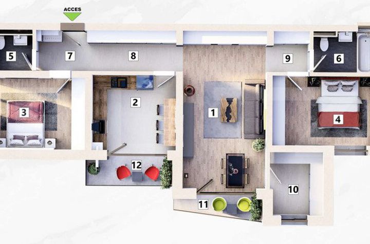 Livingul generos este perfect pentru relaxare sau socializare, în timp ce dormitorul, luminos și primitor, devine refugiu ideal după o zi aglomerată. Balconul adăugat oferă un loc perfect pentru a savura cafeaua de dimineață sau pentru a vă relaxa în serile călduroase.