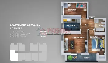 - Compartimentare: hol, living spatios cu acces la terasa, dormitor cu balcon privat, dormitor matrimonial, bucatarie inchisa, 1 grup sanitar complet utilat.