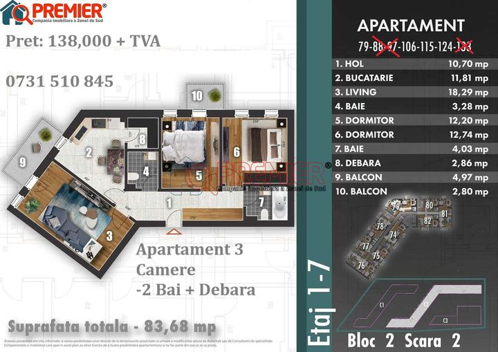 STU - SUPRAFAȚA TOTALĂ UTILĂ: 83.68 mp,SUPRAFAȚĂ TERASE/BALCOANE: 7.77 mp