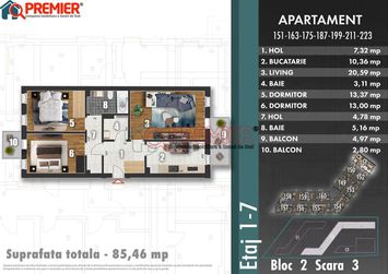 STU - SUPRAFAȚA TOTALĂ UTILĂ: 85.46 mp,SUPRAFAȚĂ TERASE/BALCOANE: 7.77 mp