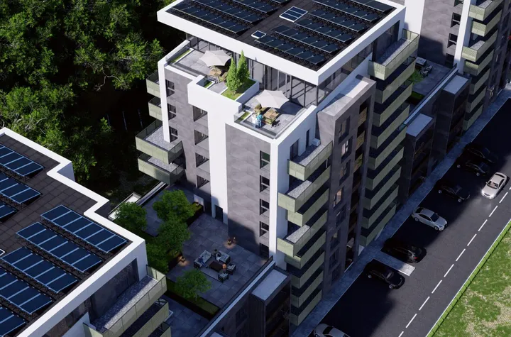 Constructie: Fatada ventilata, izolatie vata bazaltica 15 cm, panouri fotovoltaice pentru spatii comune.