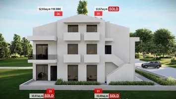 Apartament nou in ansamblul "Ismene", pe doua nivele, suprafata totala 52,65 mp; compus din 2 dormitoare, living-cu-bucatarie (salokouzina) si 2 bai.