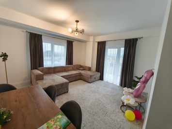 Livingul spațios are acces la un balcon, ideal pentru relaxare și socializare.